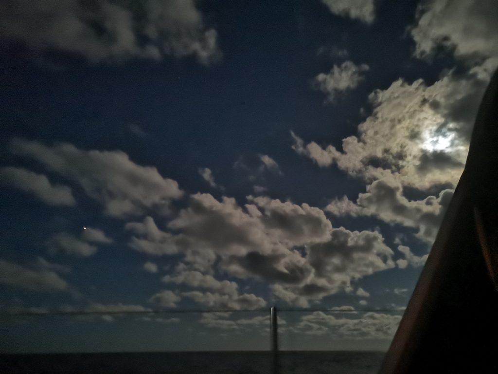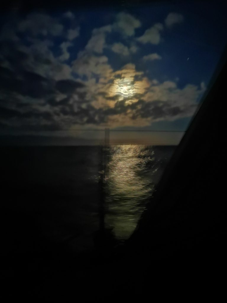 Second Skipper woke at about half past three, and after the most cursory of reports (all clear, nothing to see here) I dived into the forepeak, a comfortable seaberth in these conditions and mercifully far away from the engine and the ‘singing’ noise that is more or less constant now when the boat rolls even slightly to port.