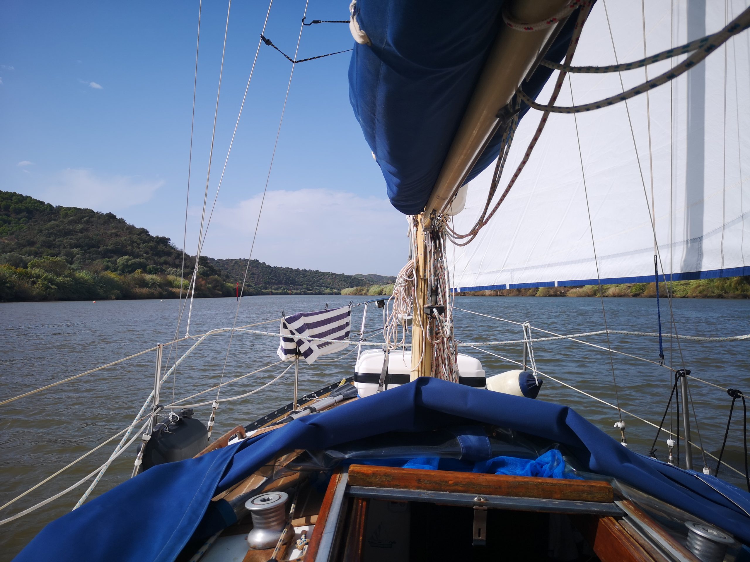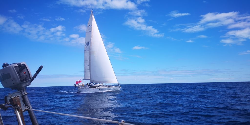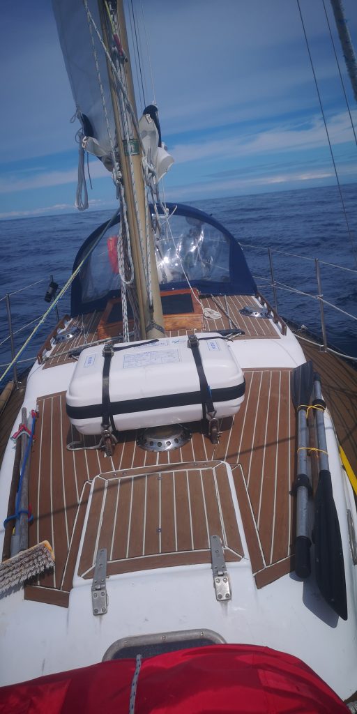 Engine off, sailing under full main and genoa on a broad reach. Still a bit of weather helm when the wind gets over 11 or 12 knots, but nothing unmanageable. The first reef has been in since Ardglass, so it’s good to get the creases out! It was the first time we have had the mainsail up since our first Biscay night.