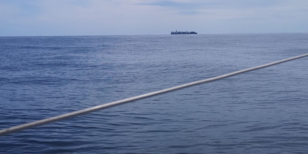 Got my head down at three, large ship with dodgy CPA appeared minutes later and I was called up to see it cross our bow a quarter of a mile ahead. Apart from that, even an alarm on the radio failed to keep me awake. Wind still astern so a bit stinky with the odd whiff of exhaust blowing in, but I was loving that bunk the way you do on the third day of a short-handed passage.