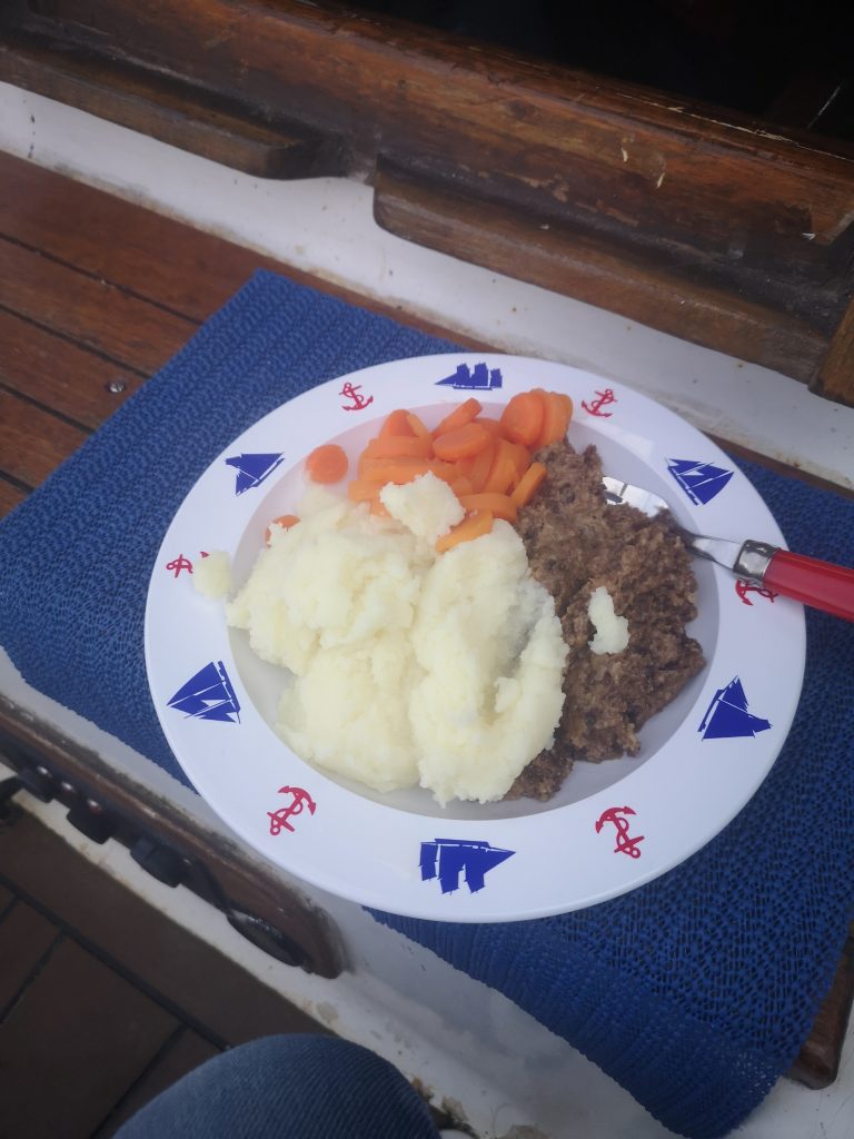 Catherine cooking up haggis, tatties and carrots. Hearty boat fare, followed by washing up in seawater in the cockpit.