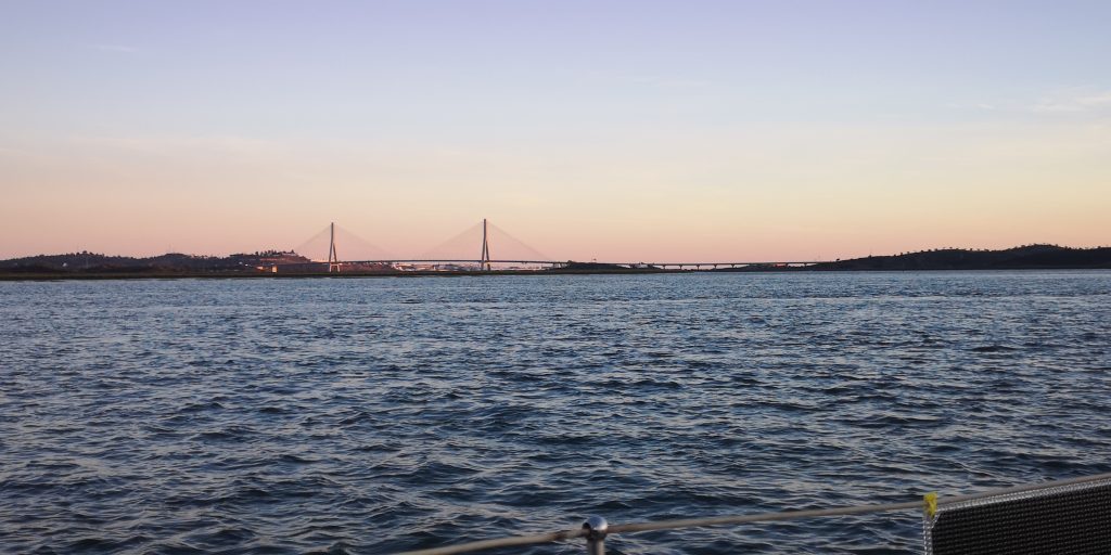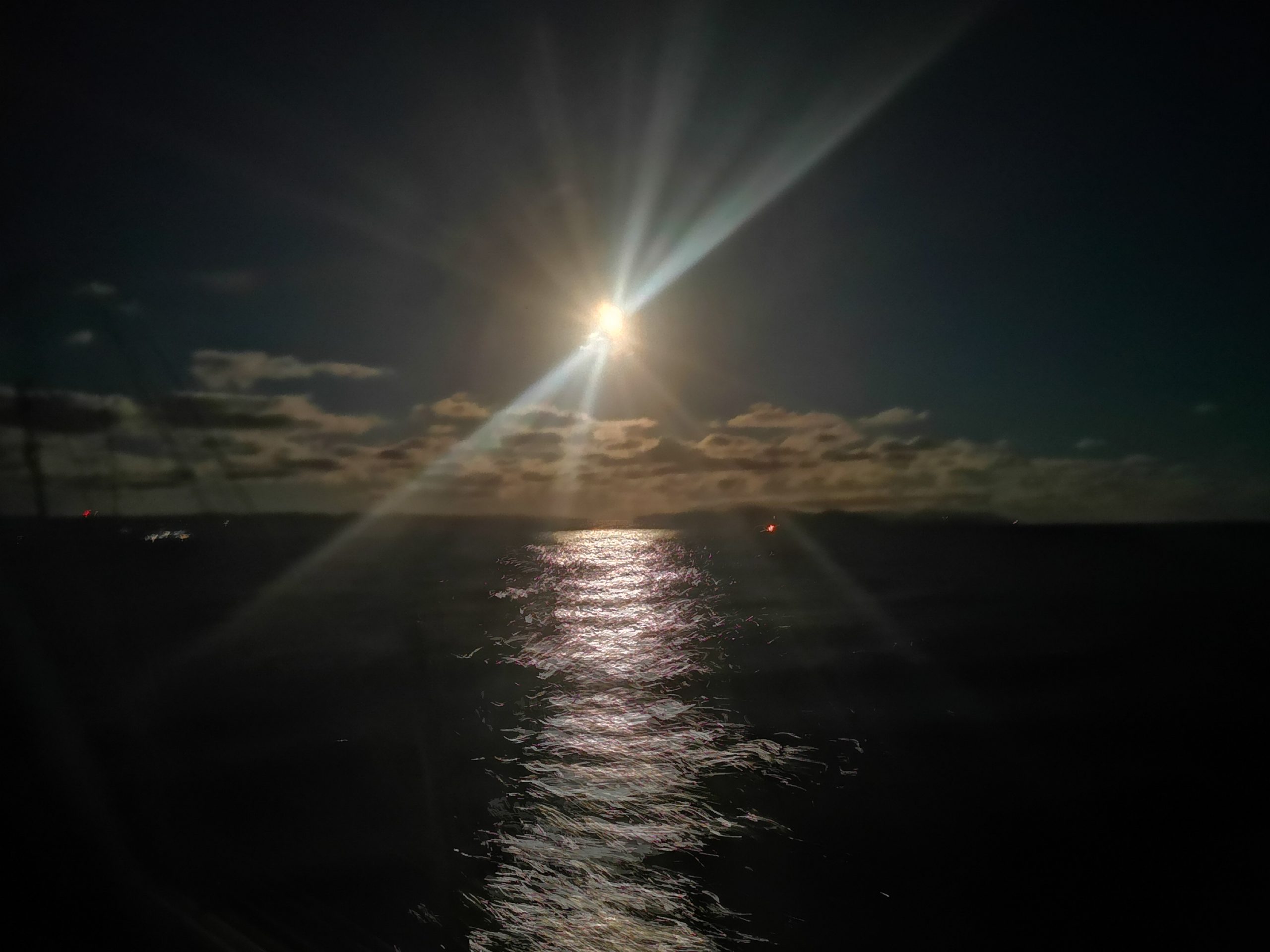 Up to find the moon had broken out of its cloudy prison and was lighting our water road to Spain again. Oaty biscuit and coffee and three hours ahead of me to amuse myself. Last watch I retrospectively plotted some positions on our current large-scale passage chart and scribbled the log book up to date. This watch it is most likely going to be ‘Hell on Earth’ on the Kindle, with the screen turned down extra low to preserve my night vision.
