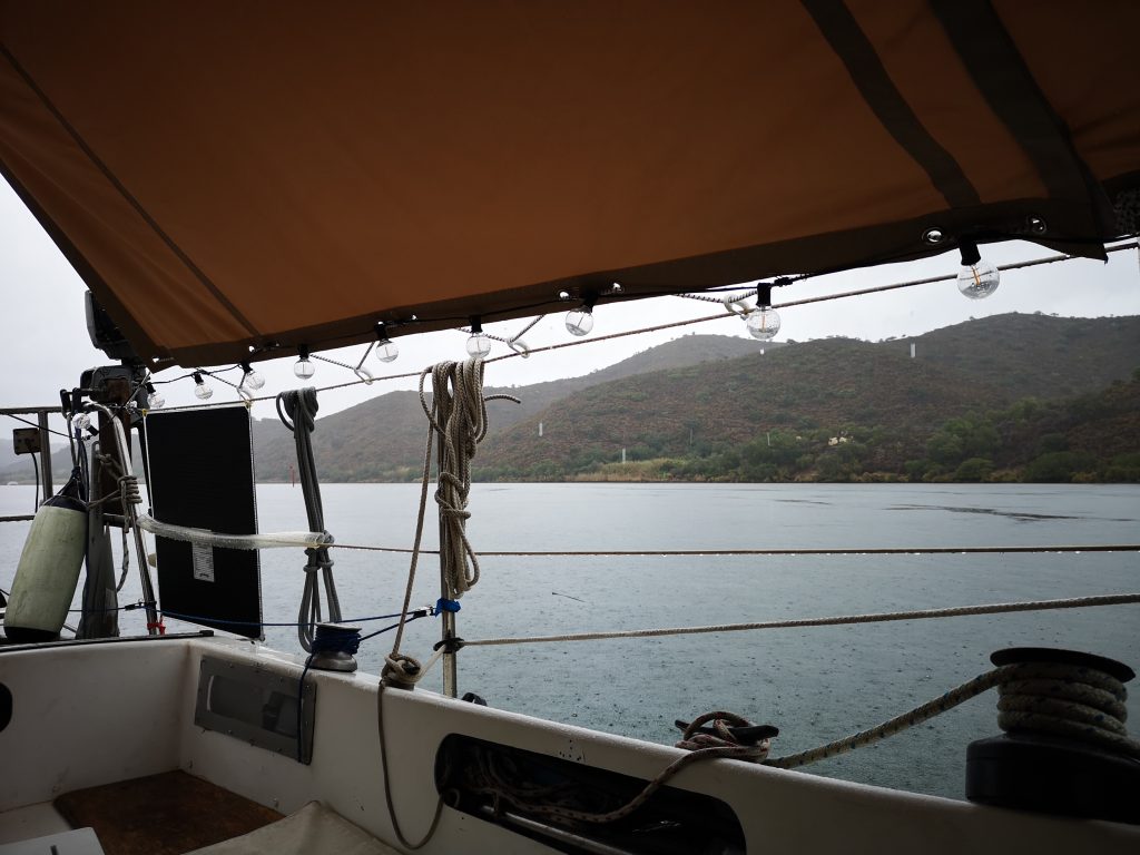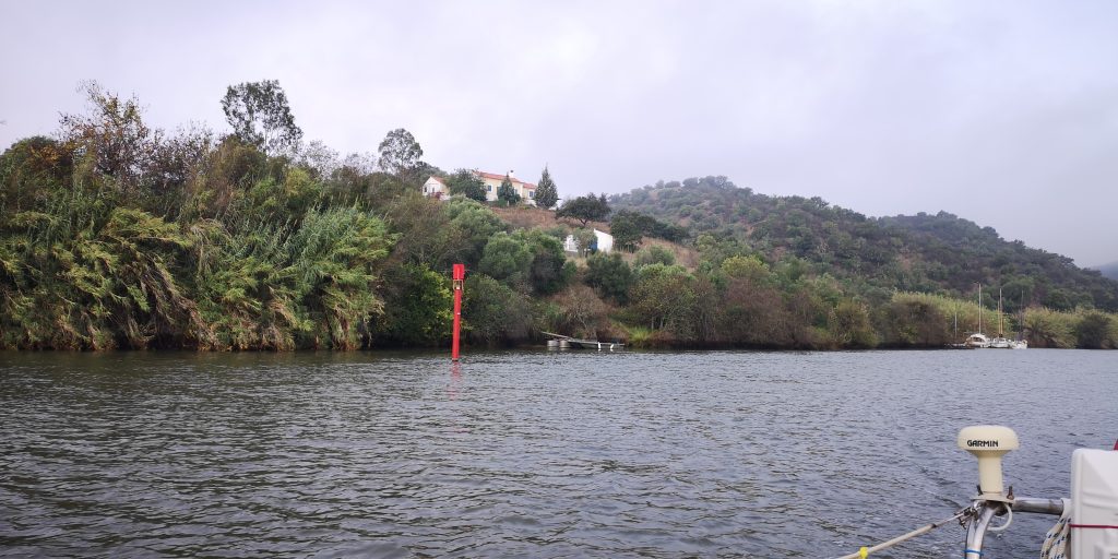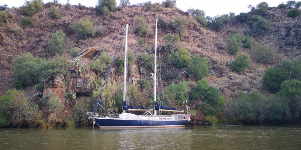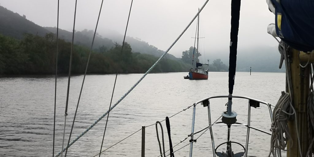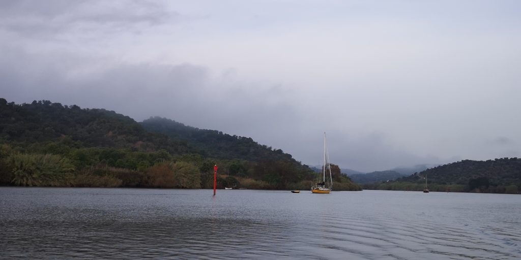 We have 40m chain out in about 11m at the current state of tide, an hour and a half to high water. I would put some of the warp out as well, but it makes recovery more difficult in an emergency as the windlass won’t get a grip – and anyway I don’t really want to drop back much further. Getting out before dawn is not an option as this wee bay is hemmed in by densely packed mussel rafts (viveiros) that can only be navigated safely in full daylight.