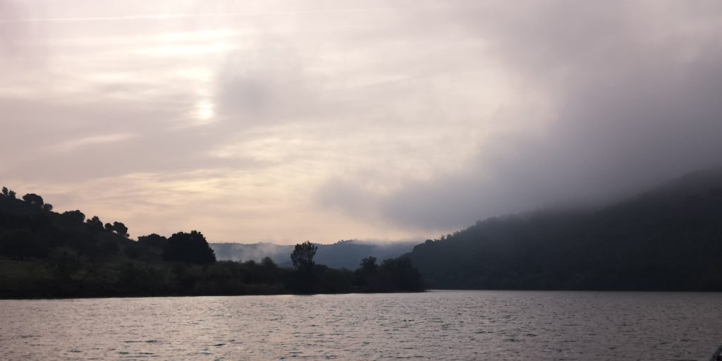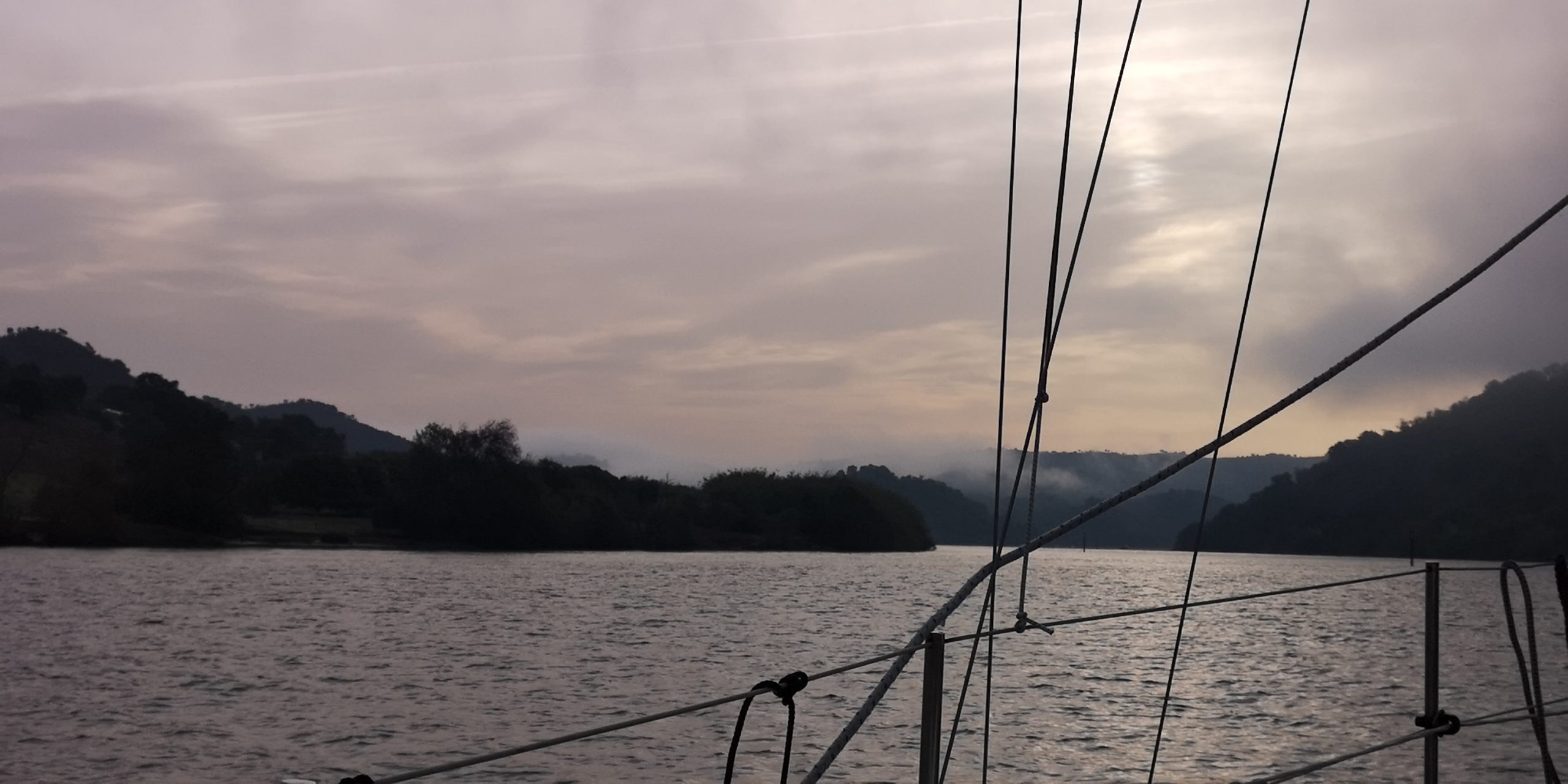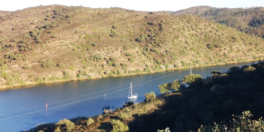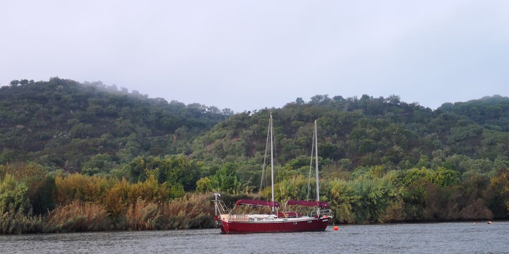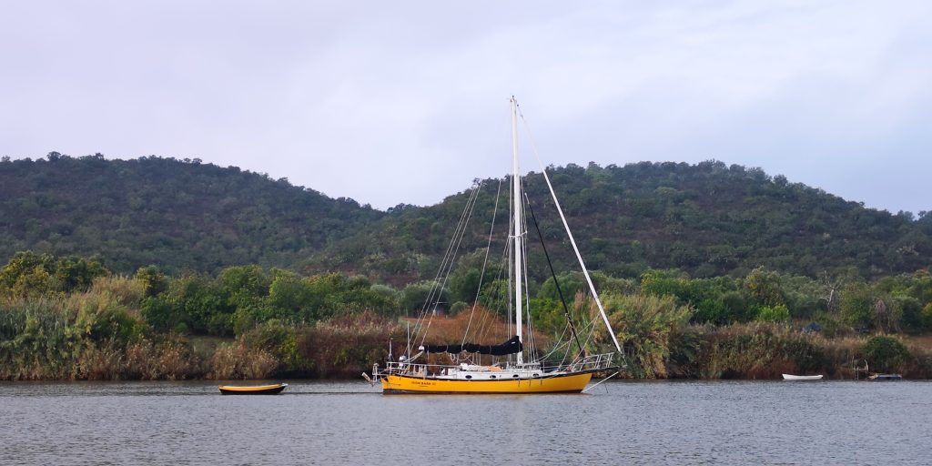 We have 40m chain out in about 11m at the current state of tide, an hour and a half to high water. I would put some of the warp out as well, but it makes recovery more difficult in an emergency as the windlass won’t get a grip – and anyway I don’t really want to drop back much further. Getting out before dawn is not an option as this wee bay is hemmed in by densely packed mussel rafts (viveiros) that can only be navigated safely in full daylight.