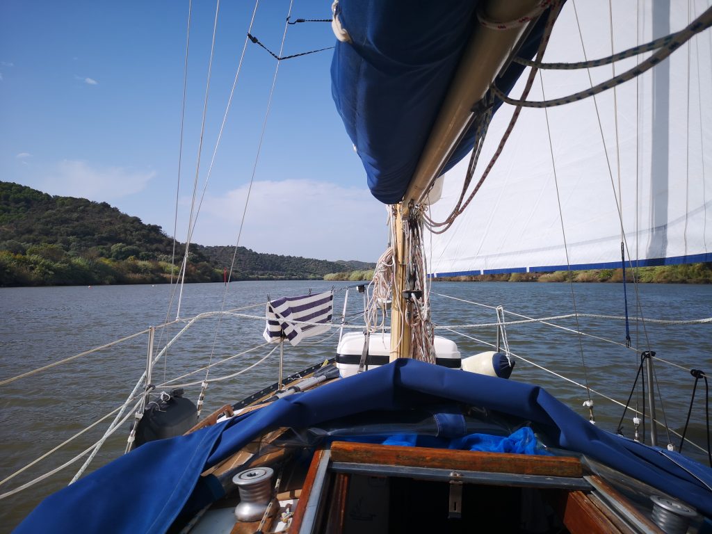 Reduce genoa further and gybe to go round the dodgy rocks off Cabo Villano. The GPS on my phone appears to pack in whenever danger threatens, but fortunately I took the precaution of installing Navionics on Catherine’s phone as well. With El Bufardo abeam we turn onto a very breezy beam reach under heavily reefed genoa and head for the welcome shelter of the ria.