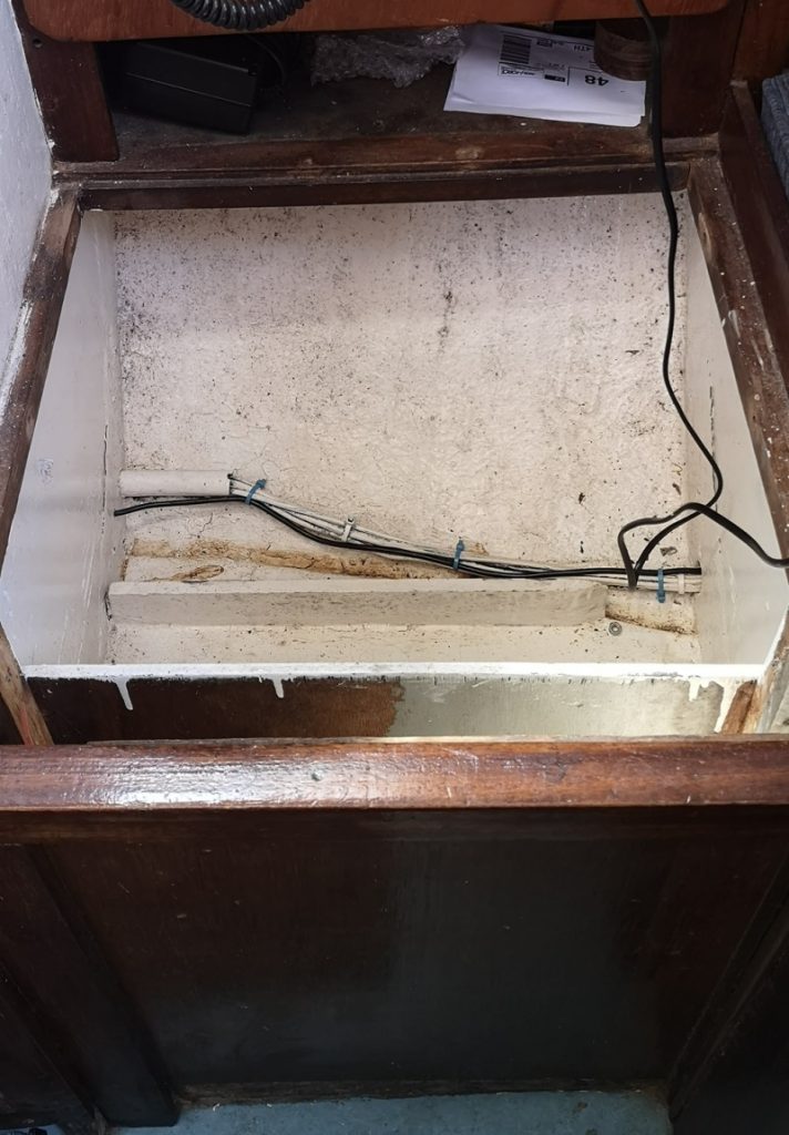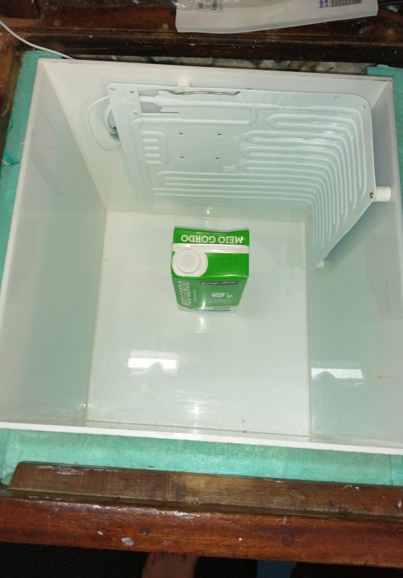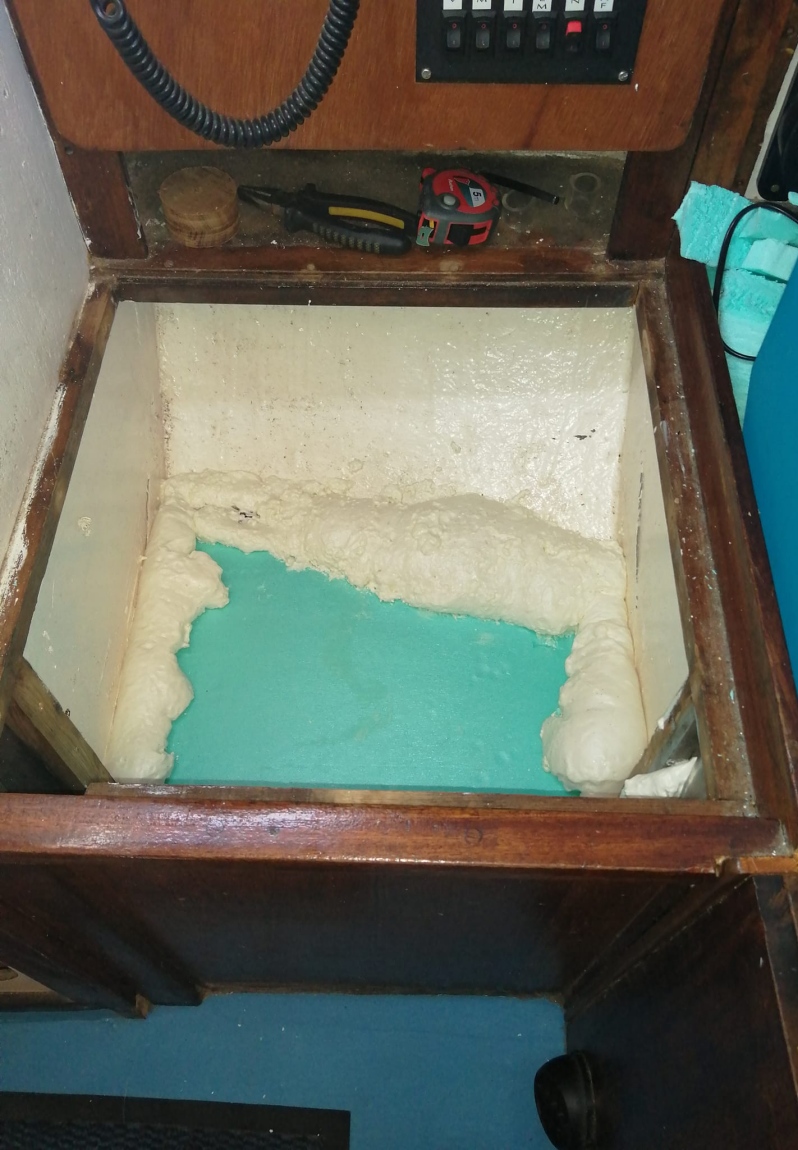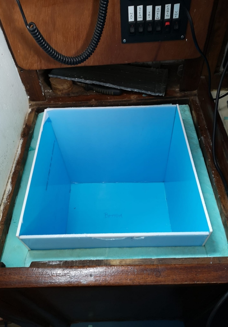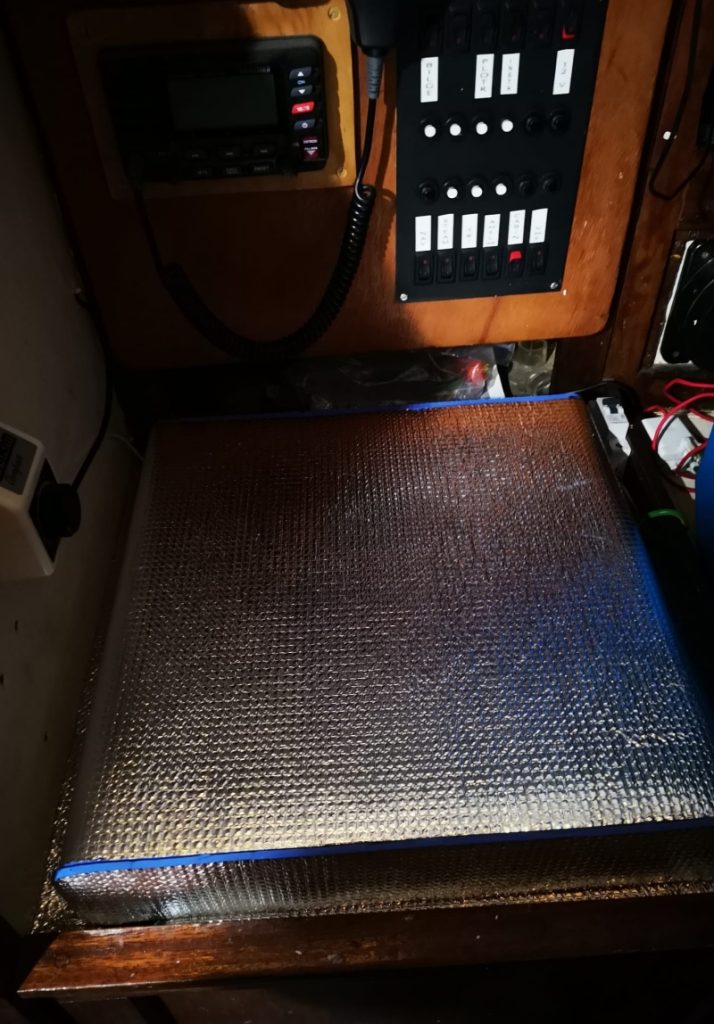 We had received the Isotherm compressor, control unit and plate from Force4 back in June – it had been delivered to Portimao marina without issue except for an unexpected charge.. I had got as far as deciding on a space for the fridge – the storage area underneath the old chart table seat forward of the starboard quarter berth – and had bought some expanded polystyrene to insulate it. The compressor was going to go behind the cooker in what was otherwise dead space. However, before I started I decided I wanted to use mostly celotex instead, as it has a considerably higher insulation value than expanded polystyrene and the insulation was only 50mm in the tightest spots.