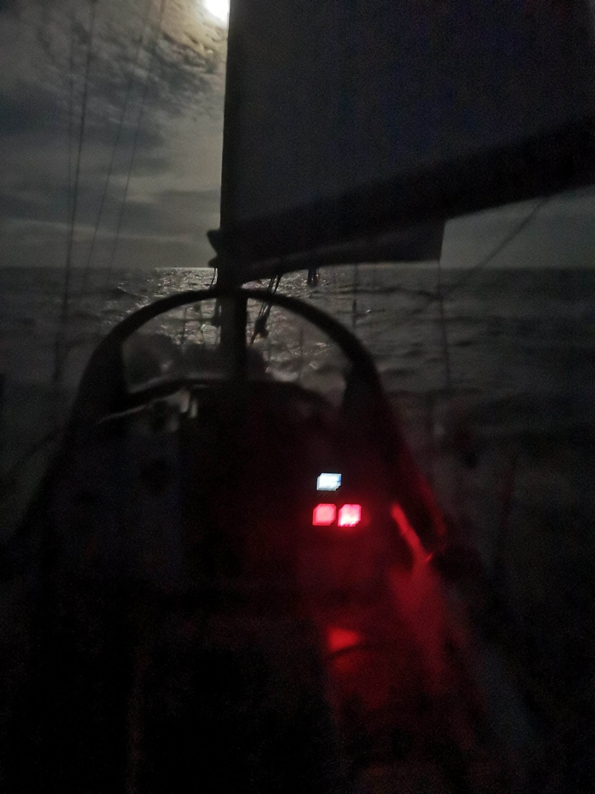 Nick unsure if Navik will work, suspicious AIS not working, and radio not working, feeling disheartened. But lo and behold, radio started working, we set off at 1pm with good wind, Navik worked, and AIS! First 17 or 18 hours of trip sailed non stop, Navik perfect, wind range between 10 and 20 kts. Sadly had to motor the rest of the way, very little wind, so boat very rolly, not a lot of sleep over last two days.
