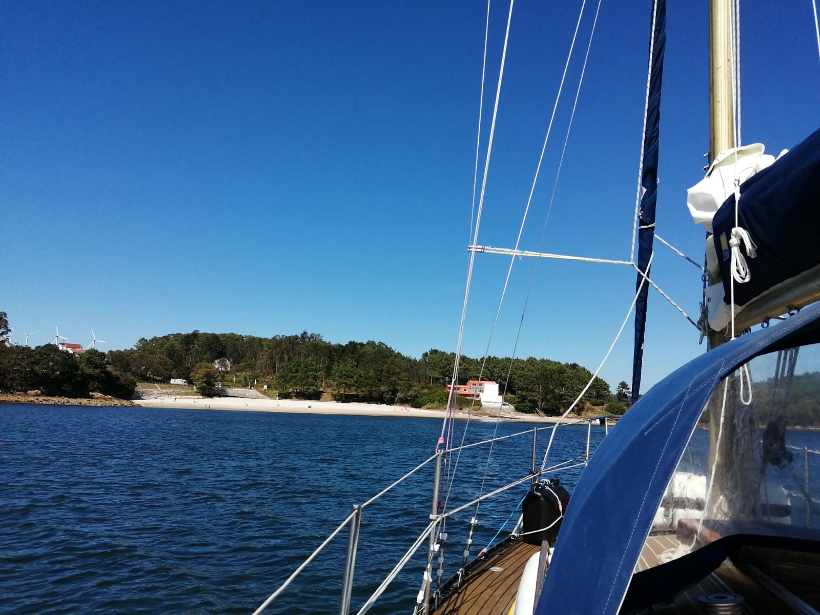 Very little wind, and very rolly, got two hours sailing under genoa, rest motored. Arrived Cedeiro, and dropped anchor at 3.55pm. Blew up dingy and went ashore, everyone wearing masks outside, including cafe outside seating. Had a swim at the beach, some shopping, a cool drink in an outside cafe, and back to boat for a late tea. Cedeira is beautiful, would love to spend more time here, so sad what this virus has done.
