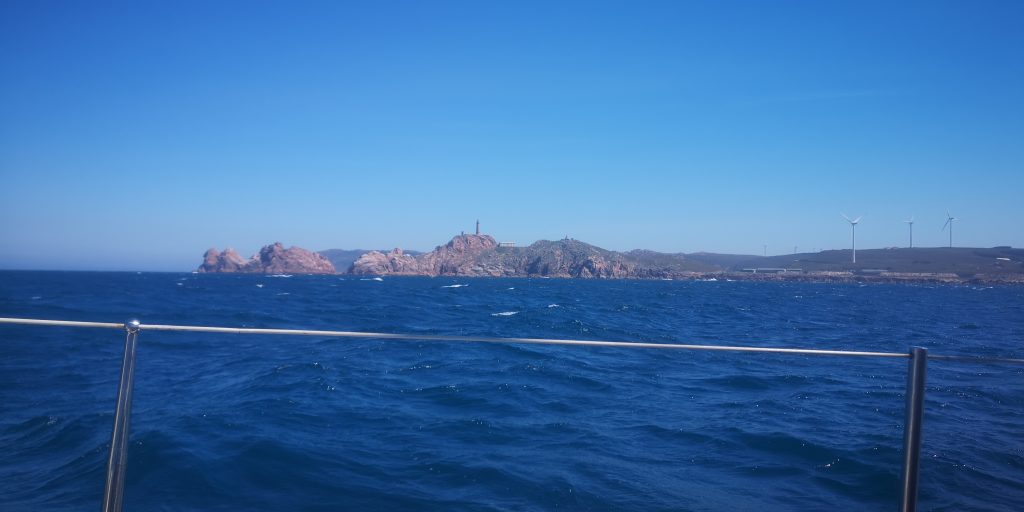 A lot warmer all day than yesterday. 10.10am, raised anchor and sailed off under genoa. 10.20 engine on, 10.45 engine off and sailing under full genoa at 18kts, gusting 23, then went further in shore to see more, and pass closer to Cape Finisterre, wind died and engine on at ten past two. Entered Ria Muros about 5.30 and were circled by a customs boat. Anchored Ensenada De San Francisco Bay at 6.15pm. Customs boat came back, and after milling around another boat for some time, came over to us asking to see our documents, and asking where we’d come from, and our final destination, were very polite, and friendly, but was very weird. Discovered chicken we’d bought to make curry was rotten, made ommelate instead.